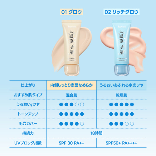 fwee公式サイトでは、01が混合肌に、02が乾燥肌におすすめだと紹介されています。