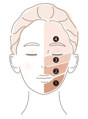 • ②専用パフで、あご→頬→額→目元の順に塗布